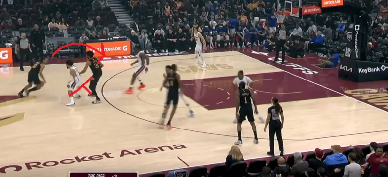 骑士高位三人配合,哈登skip出球给阿伦,随后利用梅里尔的掩护打接应,但梅里尔利用哈登吸引双人延误迅速切入接球,