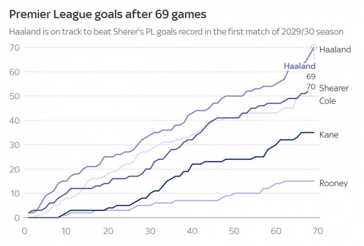 与其他英超知名前锋相比,哈兰德在69场比赛过后,已攻入70球